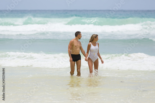 Lover couple enjoy their vacation at tropical beach together in the blue water of the Indian Ocean, in Seychelles.