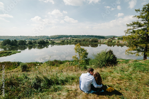 Loving couple sitting by the lake and admiring the scenery. Happy woman and man kissing on nature. Family hugging together on a sunny summer day. Back view.