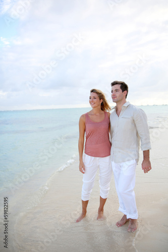 Loving couple walking by the beach at sunset