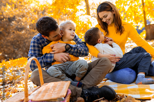 Loving family with two young sons enjoying a cozy autumn picnic in the park. They are smiling and hugging each other.