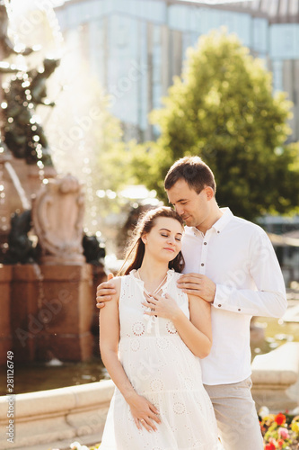 Loving husband gently hugging his pregnant wife. behind them is a fountain. Germany, Leipzig