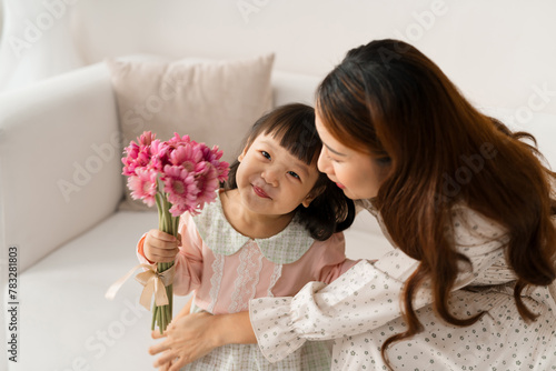 loving small daughter congratulate happy mother