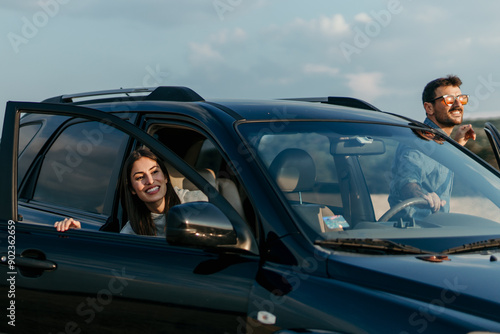 Loving urban styled couple getting out of the car, ready to enjoy sunset in the nature