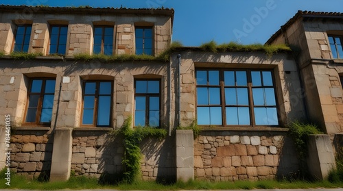 Low angle of weathered stone walls of old industrial building with latticed windows and overgrown.generative.ai