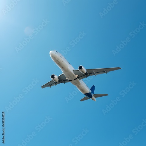 Low angle view of a commercial passenger airplane flying in a bright, clear blue sky with the sun shining