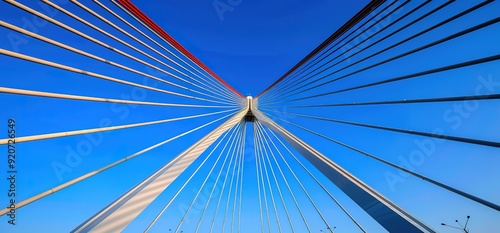 Low angle view of a suspension bridge against a bright blue sky. The bridge is made of steel cables and towers, and it appears to be very large.