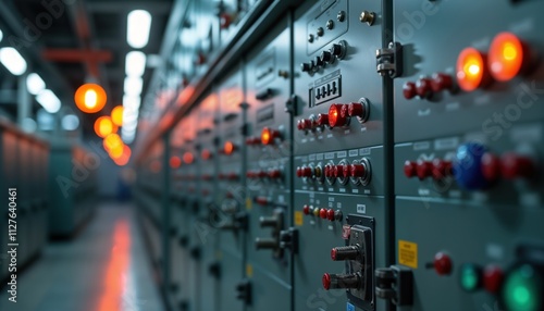Low voltage switchgear at power plant. Electrical tech equipment controls energy distribution. Many red, blue buttons, switches, indicators. Industrial tech automation, electric network. Modern power