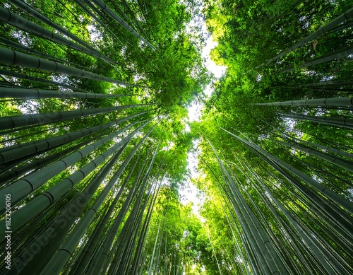 Low-angle view through a dense grove of towering, green bamboo stalks
