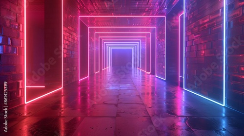 Low-light hallway with neon lights on dark floor