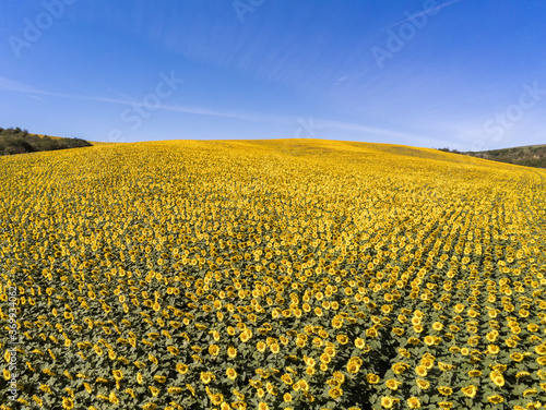 Luftaufnahme eines riesigen Sonnenblumenfeldes auf einem Hügel vor blauem Himmel