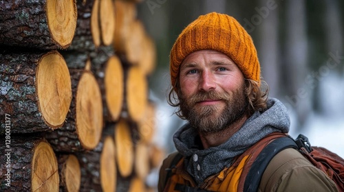 Lumberjack portrait, winter woods, log pile background, environmental work