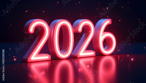 Luminous 3D Neon 2026 Text Design with Red Glowing Numbers and Sparkling Particles on Reflective Dark Surface