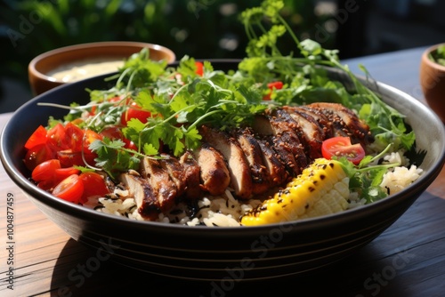 Lunch salad. Buddha bowl with sarracene wheat porridge, grilled chicken fillet, , generative IA