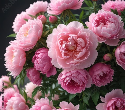 Luscious pink peonies and roses bouquet Ample copy space , template, background, spring