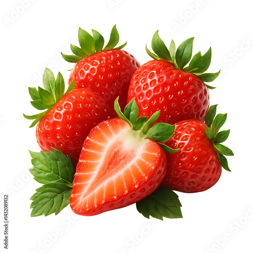 Luscious Red Strawberries A Close-Up of Fresh, Juicy Fruits with Green Leaves, One Halved to Reveal Its Sweet Interior
