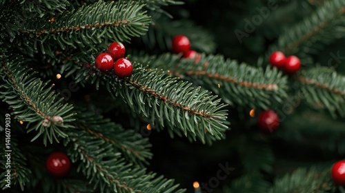 Lush evergreen branches with red berries winter holiday nature background