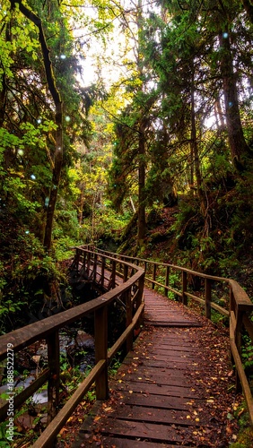 Lush forest path, wooden bridge