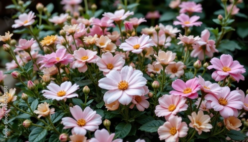 Lush Garden of Delicate Pink and Cream Flowers Blooming in a Serene Natural Setting