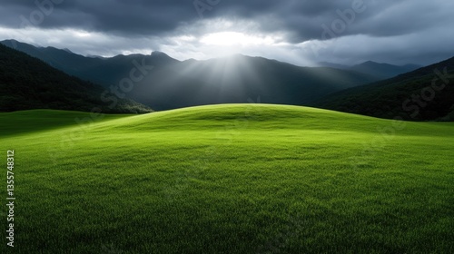 Lush green field, sunbeams piercing clouds over mountains
