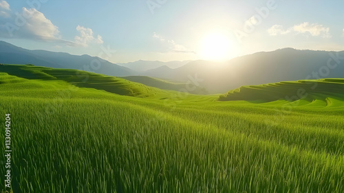 Lush Green Grassy Field and Rolling Hills Landscape Under Bright Sunlight with Blue Sky Pixelated Style