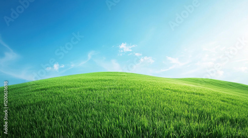 Lush green grassy hills under bright blue sky create serene landscape. vibrant colors evoke sense of tranquility and peace in nature