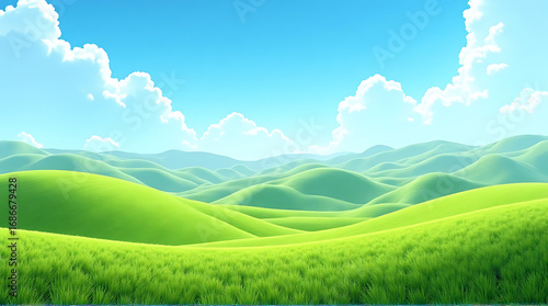 Lush green hills meet a serene blue sky in this captivating landscape illustration