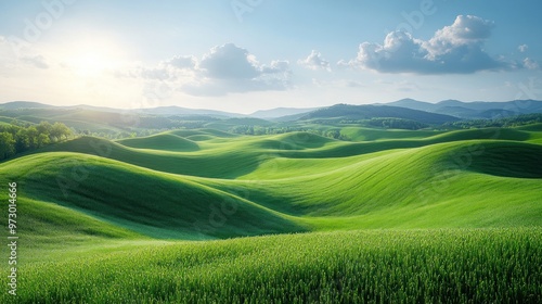 Lush green hills under a bright sky, showcasing natural beauty.