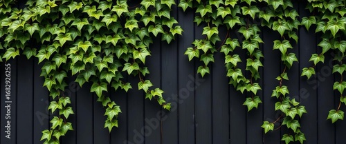 Lush green ivy climbing a black wooden wall, leaving central space , liana, dark