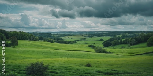 Lush Green Landscape Under Dramatic Cloudy Sky with Open Space for Text and Creative Inspiration