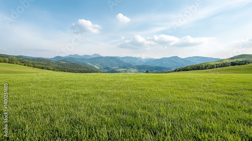 Lush green landscape with rolling hills and distant mountains under clear blue sky