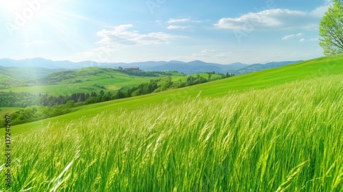 Lush Green Meadow Under Bright Blue Sky in Vibrant Nature Landscape