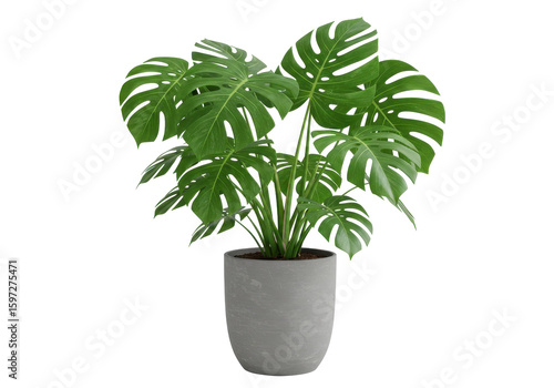 Lush green monstera plant in a modern concrete pot, bright indoor setting with sunlight