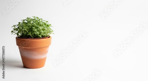 Lush green plant in simple clay pot against minimalist white background