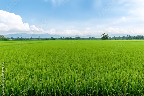 lush green rice fields under bright sky, natural landscape