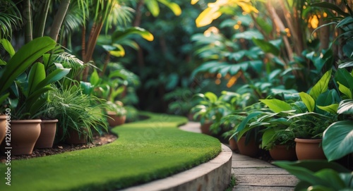 Lush green turf pathway in a vibrant tropical garden with potted plants.