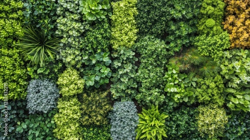 Lush green vertical garden wall, indoor plants, textured background, nature design
