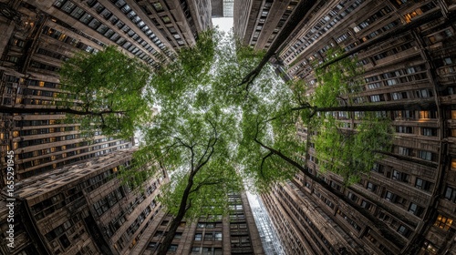 Lush greenery amidst towering city structures.