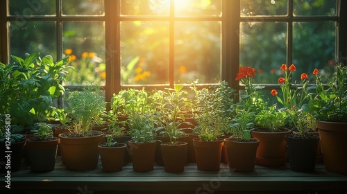Lush indoor garden with various potted plants basking in golden sunlight by a window