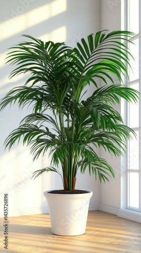 Lush indoor palm plant in a bright room with sunlight streaming through windows