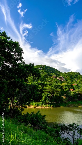 Lush landscape with mountains and river