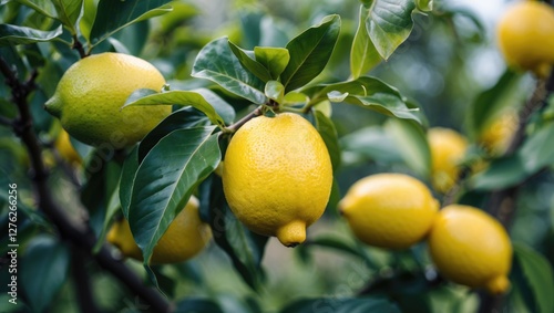 Lush Lemon Tree Branch with Ripe Yellow Lemons and Green Fruits in Early Summer Sunlight