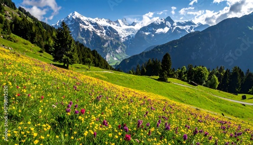 Lush meadow with wildflowers, mountains, and pristine scenery