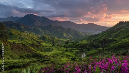 Lush mountain valley at sunset