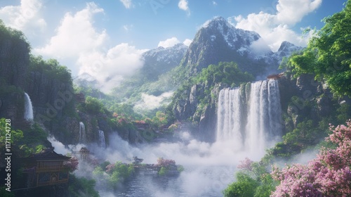 Lush mountain valley with cascading waterfalls and mist.