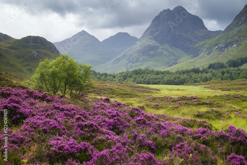 Lush purple heather blooms across a serene valley with majestic mountains under a cloudy sky