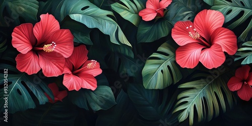 Lush Red Hibiscus Flowers and Monstera Leaves