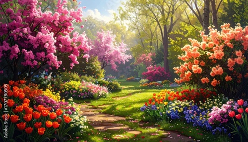 Lush Spring Garden Path with Blooming Azaleas and Tulips Under a Sunny Sky with Green Trees and Gentle Sunlight in a Dreamy Impressionistic Style