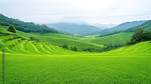Lush terraced rice paddies cascade down a valley
