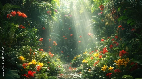 Lush tropical forest with vibrant flowers and soft sunlight beams.