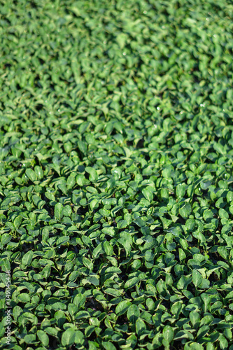 Lush vegetation in the garden. Seedlings in the greenhouse of cabbage and lettuce. Green background for vegetarians.